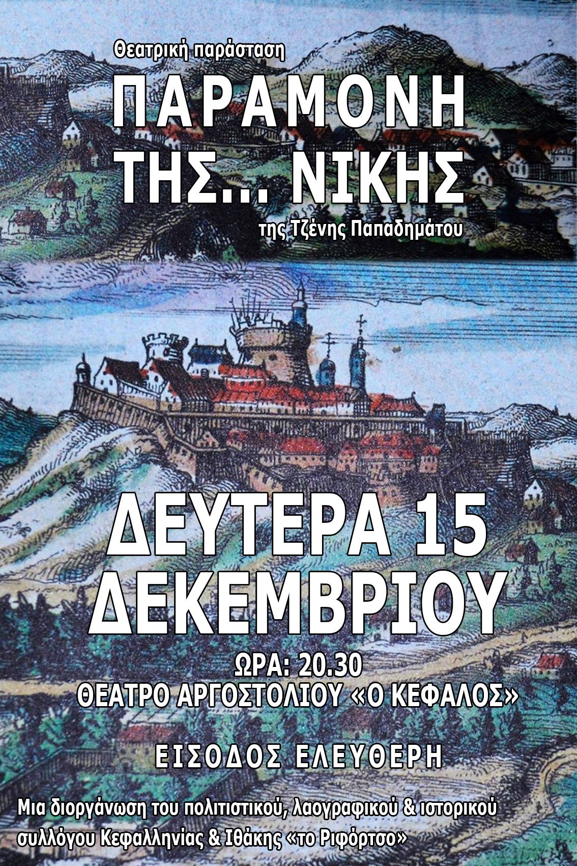 Ο Πολιτιστικός, Λαογραφικός & Ιστορικός Σύλλογος Κεφαλονιάς & Ιθάκης «το Ριφόρτσο» σας προσκαλεί στη φετινή εορταστική εκδήλωσή του, που θα πραγματοποιηθεί τη Δευτέρα 15 Δεκεμβρίου, στις 20:30, στο θέατρο Αργοστολίου «ο Κέφαλος». Η θεατρική ομάδα του συλλόγου παρουσιάζει για πρώτη φορά το αυθεντικό έργο «Η Παραμονή της… Νίκης» της Τζένης Παπαδημάτου. Εμπνευσμένη από αληθινά γεγονότα των τελών του 15ου αιώνα και γραμμένη ειδικά για την περίσταση, η παράσταση ζωντανεύει στιγμές της ιστορίας και της παράδοσης του τόπου μας, μέσα από μια δυναμική και συγκινητική αφήγηση. Στο έργο συμμετέχει και το χορευτικό τμήμα του συλλόγου. Κατά τη διάρκεια της βραδιάς θα