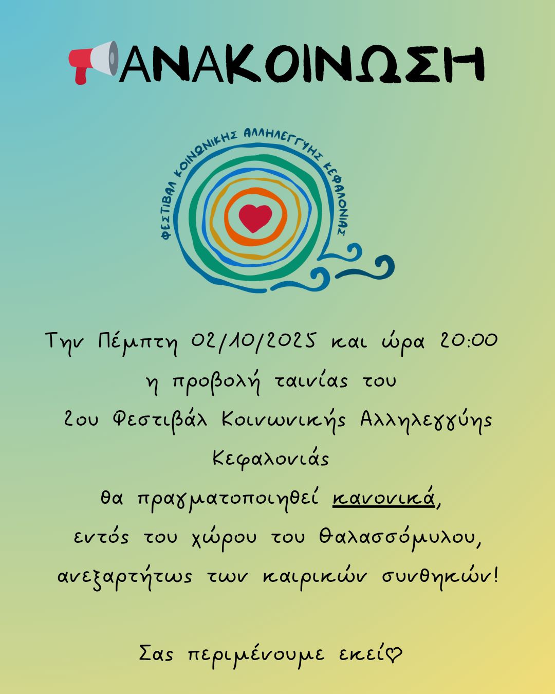 Την Πέμπτη 2/10/2025 και ώρα 20:00 η προβολή ταινίας του 2ου Φεστιβάλ Κοινωνικής Αλληλεγγύης Κεφαλονιάς, θα πραγματοποιηθεί κανονικά, εντός του χώρου του Θαλασσόμυλου, ανεξαρτήτως των καιρικών συνθηκών.