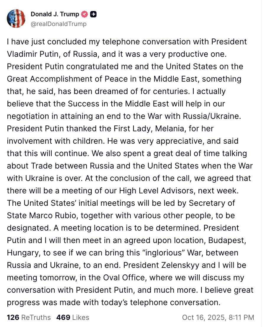 «Μόλις ολοκλήρωσα μια πολύ παραγωγική τηλεφωνική επικοινωνία με τον Πρόεδρο Πούτιν. Με συνεχάρη εμένα και τις ΗΠΑ για την ειρήνη στη Μέση Ανατολή και είπε ότι θα μπορούσε να βοηθήσει στον τερματισμό του πολέμου Ρωσίας-Ουκρανίας.