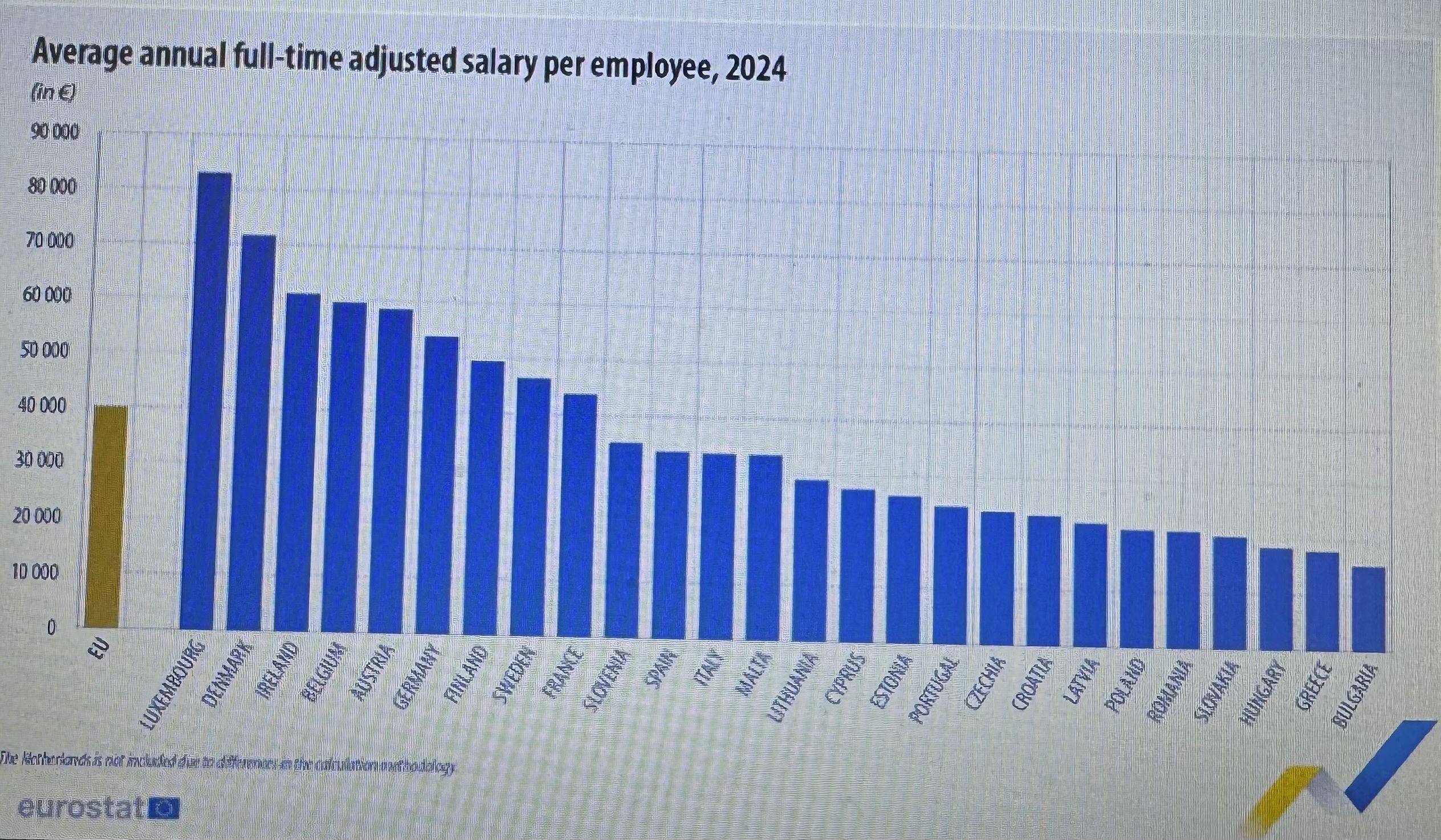 Οι υψηλότεροι μέσοι μισθοί στην ΕΕ καταγράφηκαν στο Λουξεμβούργο (83.000 ευρώ), ακολουθούμενο από τη Δανία (71.600 ευρώ) και την Ιρλανδία (61.100 ευρώ).