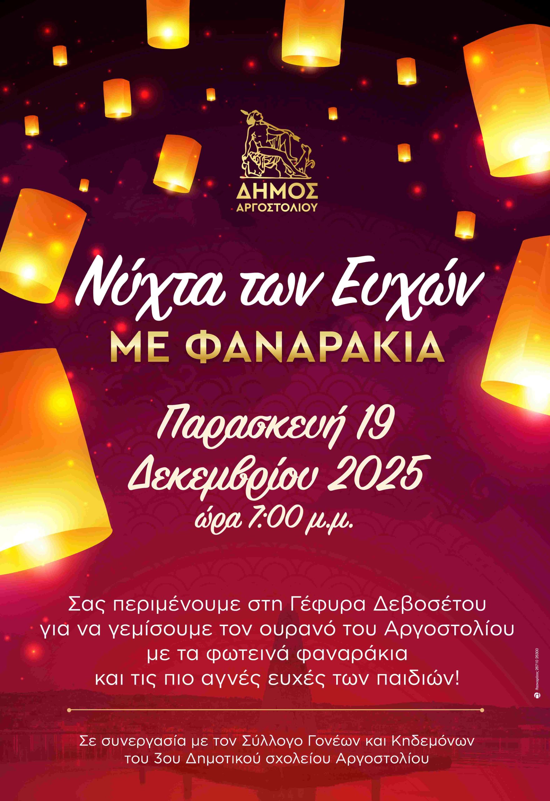 Ο Δήμος Αργοστολίου, σε συνεργασία με τον Σύλλογο Γονέων και Κηδεμόνων του 3ου Δημοτικού σχολείου Αργοστολίου, διοργανώνουν την εντυπωσιακή «Νύχτα των Ευχών», όπου ο ουρανός θα πλημμυρίσει από τα φωτεινά φαναράκια και τις πιο αγνές ευχές των παιδιών της πόλης.