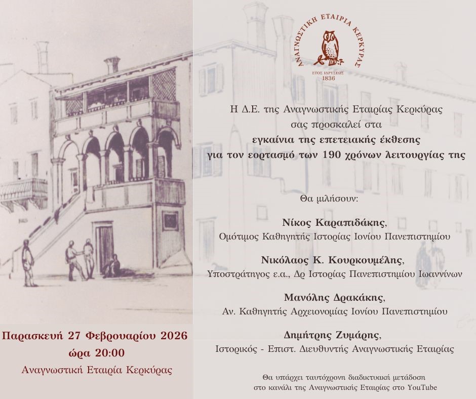 • Πρόσκληση στα εγκαίνια της επετειακής έκθεσης για τον εορτασμό των 190 χρόνων λειτουργίας της Αναγνωστικής Εταιρίας Κερκύρας
