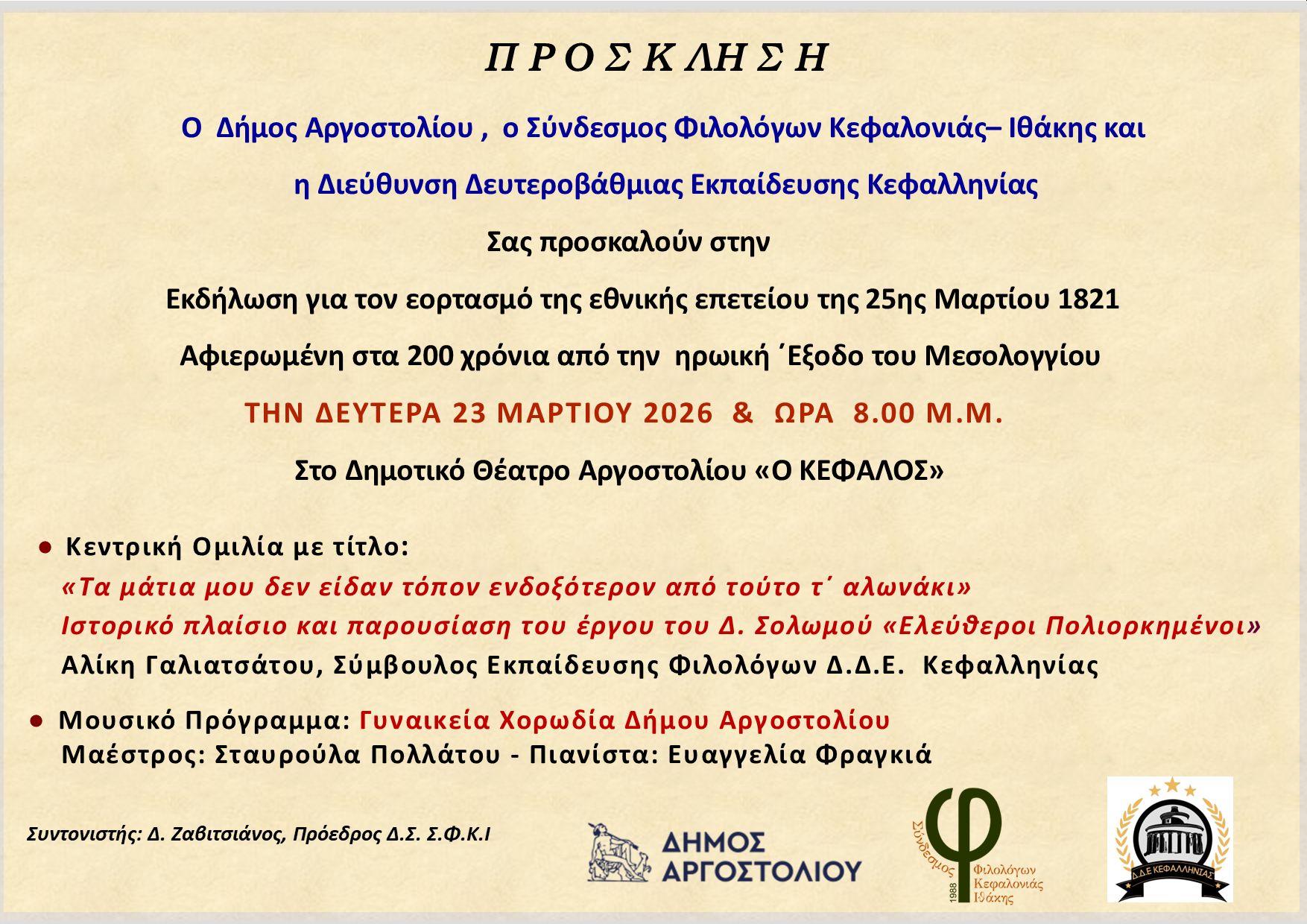 Με ιδιαίτερη χαρά σας προσκαλούμε στην Εκδήλωση για τον εορτασμό της εθνικής επετείου της 25ης Μαρτίου 1821 , την οποία συνδιοργανώνουμε με τον Δήμο Αργοστολίου και τη Διεύθυνση Δευτεροβάθμιας Εκπαίδευσης Κεφαλληνίας
