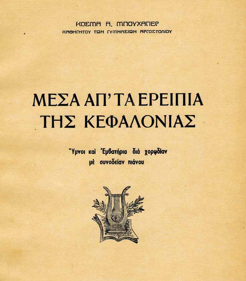 Κατά το διάστημα όπου μαθήτευα στο Ωδείο του Αργοστολίου, συναντούσα στην πλατεία του της πόλης αυτής, τον αξιόλογο συνθέτη και δάσκαλο της μουσικής, όπου και ανάμεσά μας αναπτύχθηκε μια φιλία, που κύριο λόγω είχε τη μελέτη της μουσικής και τα τοπικά ιστορήματα της θείας τέχνης. Ο Μπουχάγιερ μου έδωσε σε αντίγραφα πολλά έργα του, καθώς και το βιβλίο του. «Μέσα απ’ τα ερείπια της Κεφαλονιάς», όπου σ’ αυτό φιλοξενούνται κυρίως άσματά του για σχολικές χορωδίες.