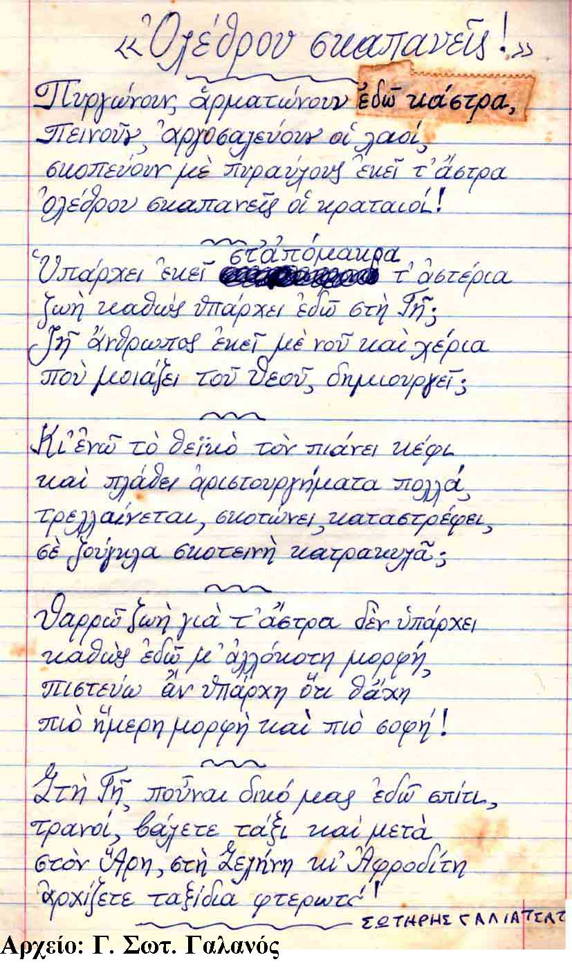Τα ποιήματα του Σωτήρη Γαλιατσάτου, είναι ανέκδοτα και αχρονολόγητα, παρουσιάζονται δε για πρώτη φορά και εκφράζουν το αντιπολεμικό πνεύμα και το φόβο, για την κακή χρήση των πυρηνικών όπλων από τους κυβερνώντες τον πλανήτη Γη.