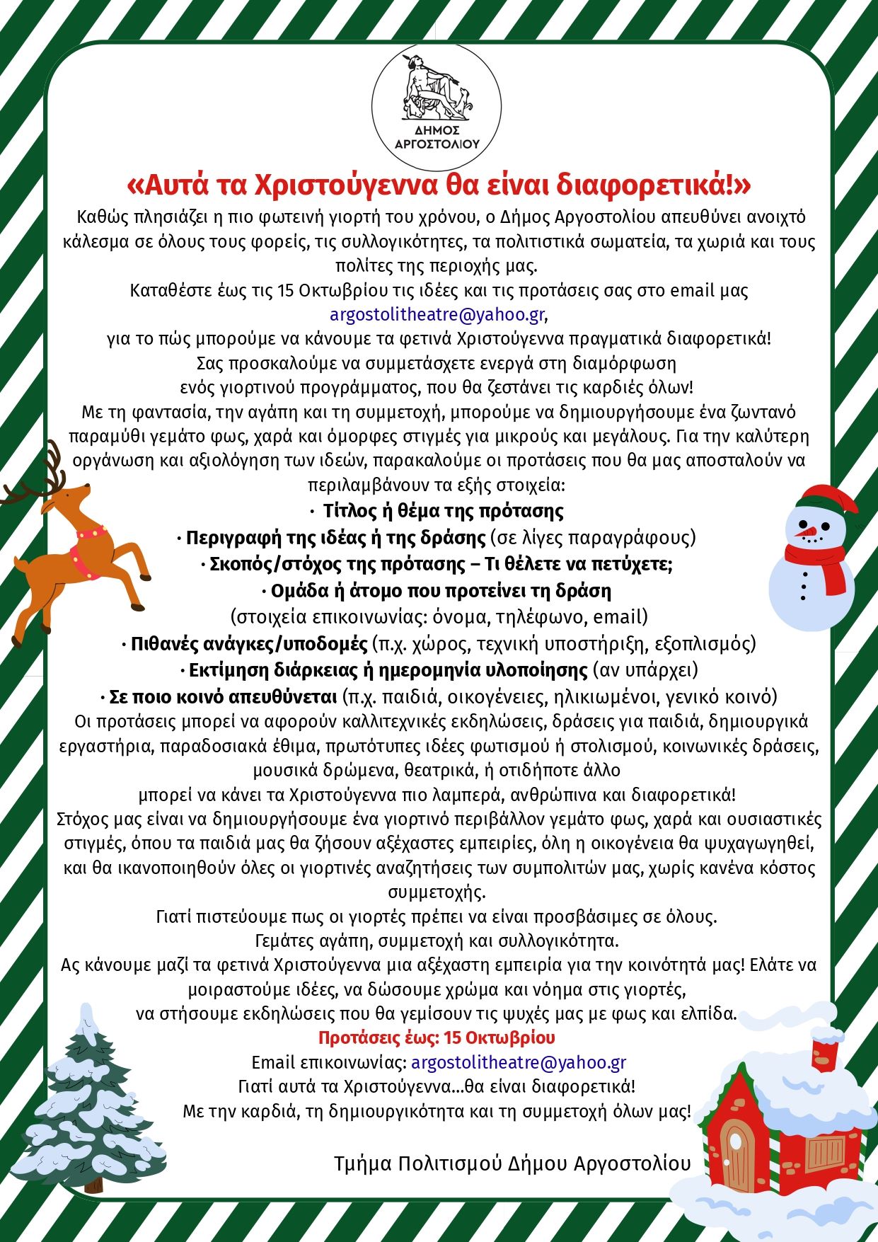 Καθώς πλησιάζει η πιο φωτεινή γιορτή του χρόνου, ο Δήμος Αργοστολίου απευθύνει ανοιχτό κάλεσμα σε όλους τους φορείς, τις συλλογικότητες, τα πολιτιστικά σωματεία, τα χωριά και τους πολίτες της περιοχής μας. Καταθέστε έως τις 15 Οκτωβρίου τις ιδέες και τις προτάσεις σας στο email μας argostolitheatre@yahoo.gr, για το πώς μπορούμε να κάνουμε τα φετινά Χριστούγεννα πραγματικά διαφορετικά! Σας προσκαλούμε να συμμετάσχετε ενεργά στη διαμόρφωση ενός γιορτινού προγράμματος, που θα ζεστάνει τις καρδιές όλων! Με τη φαντασία, την αγάπη και τη συμμετοχή, μπορούμε να δημιουργήσουμε ένα ζωντανό παραμύθι γεμάτο φως, χαρά και όμορφες στιγμές για μικρούς και μεγάλους. Για την καλύτερη