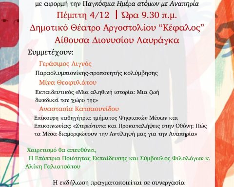 Σε συνέχεια της συνεργασίας της ομάδας EPAS των μαθητών του Γενικού Λυκείου Πάστρας, του 2ου Γυμνασίου Αργοστολίου “Ιωσήφ Μομφεράτος” και του Δήμου Αργοστολίου και με αφορμή την Παγκόσμια Ημέρα Αναπηρίας, θα πραγματοποιηθεί την Πέμπτη 4 Δεκεμβρίου και ώρα 9:30 π.μ., η εκδήλωση