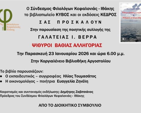 Αξιότιμες κυρίες και κύριοι, ΚΑΛΗ ΧΡΟΝΙΑ! Με ιδιαίτερη χαρά σας προσκαλούμε στην παρουσίαση της 8ης ποιητικής συλλογής της Γαλάτειας Βέρρα με τίτλο ΨΙΘΥΡΟΙ ΒΑΘΙΑΣ ΑΛΛΗΓΟΡΙΑΣ σε συνδιοργάνωση με το βιβλιοπωλείο ΚΥΒΟΣ και τις εκδόσεις ΚΕΔΡΟΣ Την Παρασκευή 23 Ιανουαρίου 2026 και ώρα