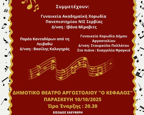 Την Παρασκευή 10 Οκτωβρίου στις 8.30μμ, στο Δημοτικό Θέατρο Αργοστολίου ‘’Ο Κέφαλος’’, θα πραγματοποιηθεί ΧΟΡΩΔΙΑΚΗ ΒΡΑΔΙΑ, με τη συμμετοχή της Γυναικείας Ακαδημαϊκής Χορωδίας από την πόλη Niš, της Σερβίας, την Παρέα Κανταδόρων από τη Λειβαθώ και τη Γυναικεία Χορωδία Δήμου Αργοστολίου. Γυναικεία