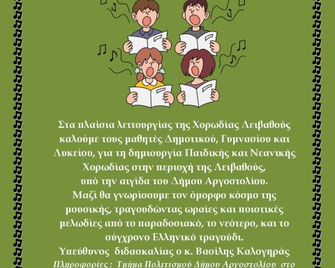 Σας ενημερώνουμε ότι στα πλαίσια της λειτουργίας της Χορωδίας Λειβαθούς, καλούμε τους μαθητές Δημοτικού, Γυμνασίου και Λυκείου, για τη δημιουργία παιδικής και νεανικής Χορωδίας στην περιοχή της Λειβαθούς, υπό την αιγίδα του Δήμου Αργοστολίου. Μαζί θα γνωρίσουμε τον όμορφο κόσμο της μουσικής,