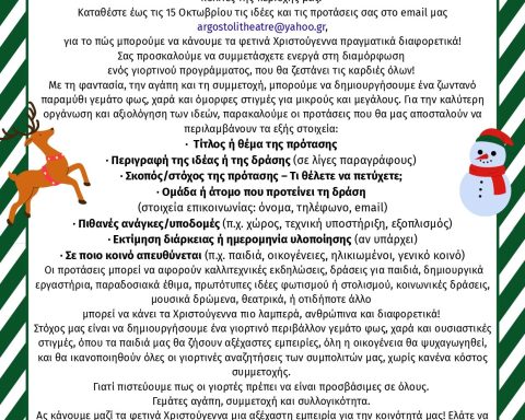 Καθώς πλησιάζει η πιο φωτεινή γιορτή του χρόνου, ο Δήμος Αργοστολίου απευθύνει ανοιχτό κάλεσμα σε όλους τους φορείς, τις συλλογικότητες, τα πολιτιστικά σωματεία, τα χωριά και τους πολίτες της περιοχής μας. Καταθέστε έως τις 15 Οκτωβρίου τις ιδέες και τις προτάσεις σας