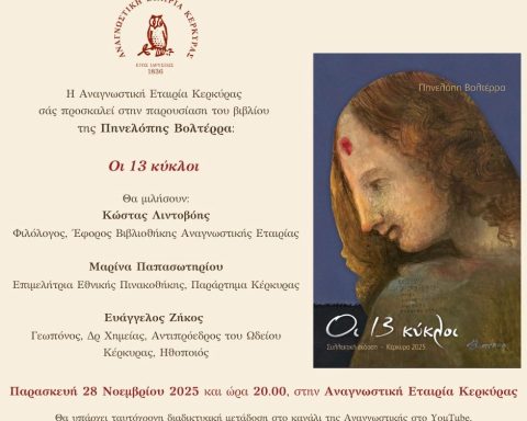 Η Δ.Ε. της Αναγνωστικής Εταιρίας Κερκύρας σάς προσκαλεί στην παρουσίαση του νέου βιβλίου της εικαστικού κυρίας Πηνελόπης Βολτέρρα, Οι 13 κύκλοι Για το βιβλίο θα μιλήσουν οι: Κώστας Λιντοβόης, Φιλόλογος, Έφορος Βιβλιοθήκης Αναγνωστικής Εταιρίας, με θέμα: «Πηνελόπη Βολτέρρα: ένας διάλογος ζωγραφικής και