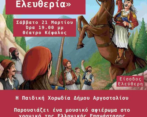 Η Παιδική Χορωδία του Δήμου Αργοστολίου, παρουσιάζει το Σάββατο 21 Μαρτίου, στις 7 μ.μ., στο Δημοτικό Θέατρο Αργοστολίου ‘’Ο Κέφαλος’’, ένα μουσικό αφιέρωμα στο χρονικό της Ελληνικής Επανάστασης του 1821 με τίτλο: ‘’Θέλει αρετήν και τόλμην η Ελευθερία’’. Διεύθυνση Χορωδίας: Αγγελος Μουρελάτος