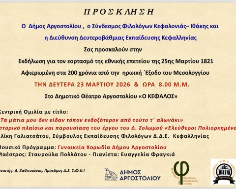 Ο Δήμος Αργοστολιού, ο Σύνδεσμος Φιλολόγων Κεφαλλονιάς – Ιθάκης και η Διεύθυνση Δευτεροβάθμιας Εκπαίδευσης Κεφαλληνίας συνδιοργανώνουν Εκδήλωση για τον εορτασμό της εθνικής επετείου της 25ης Μαρτίου 1821 την Δευτέρα 23 Μαρτίου 2026 στις 20.00 στο Δημοτικό Θέατρο Αργοστολίου «Ο ΚΕΦΑΛΟΣ» Η Εκδήλωση