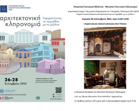 «Αρχιτεκτονική κληρονομιά. Γεφυρώνοντας το παρελθόν με το μέλλον» 26-27-28 Σεπτεμβρίου 2025 Η Επιτροπή Ποντιακών Μελετών (Ε.Π.Μ.) και το «Ιστορικό-Λαογραφικό Μουσείο Ποντιακού Ελληνισμού» συμμετέχουν στις εκδηλώσεις του Υπουργείου Πολιτισμού, στα πλαίσια των Ευρωπαϊκών Ημερών Πολιτιστικής Κληρονομιάς, με θέμα «Αρχιτεκτονική κληρονομιά. Γεφυρώνοντας το παρελθόν
